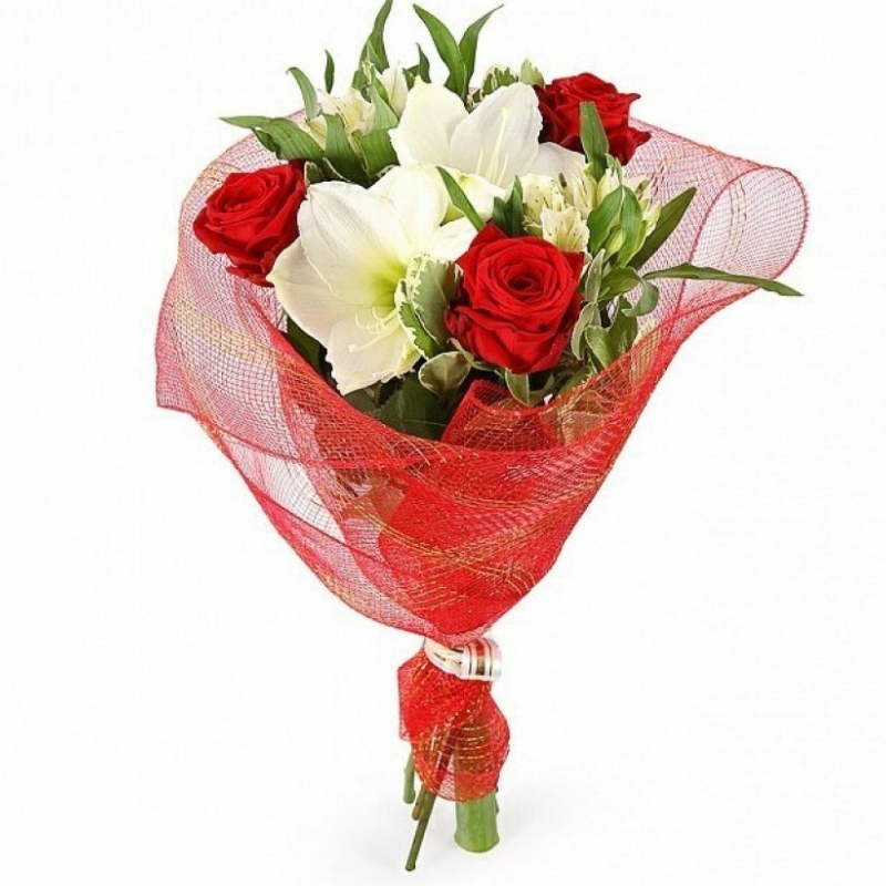 Букет состоит из 3 розы, 2 ветки альстромерии, 1 амариллис, питтоспорум, красивая упаковка, атласная лента.
