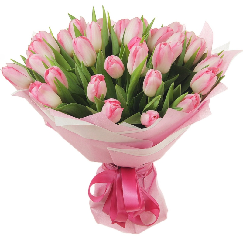 Букет состоит из 35 розовых тюльпанов, красивая упаковка, атласная лента.