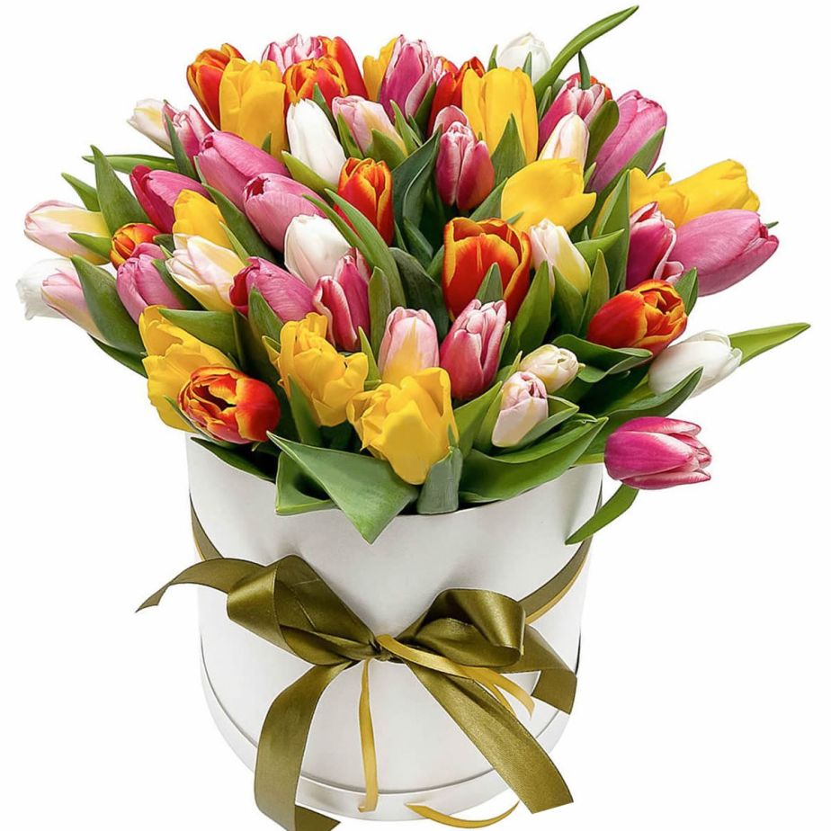 MIX из 51 тюльпана, коробка, атласная лента.