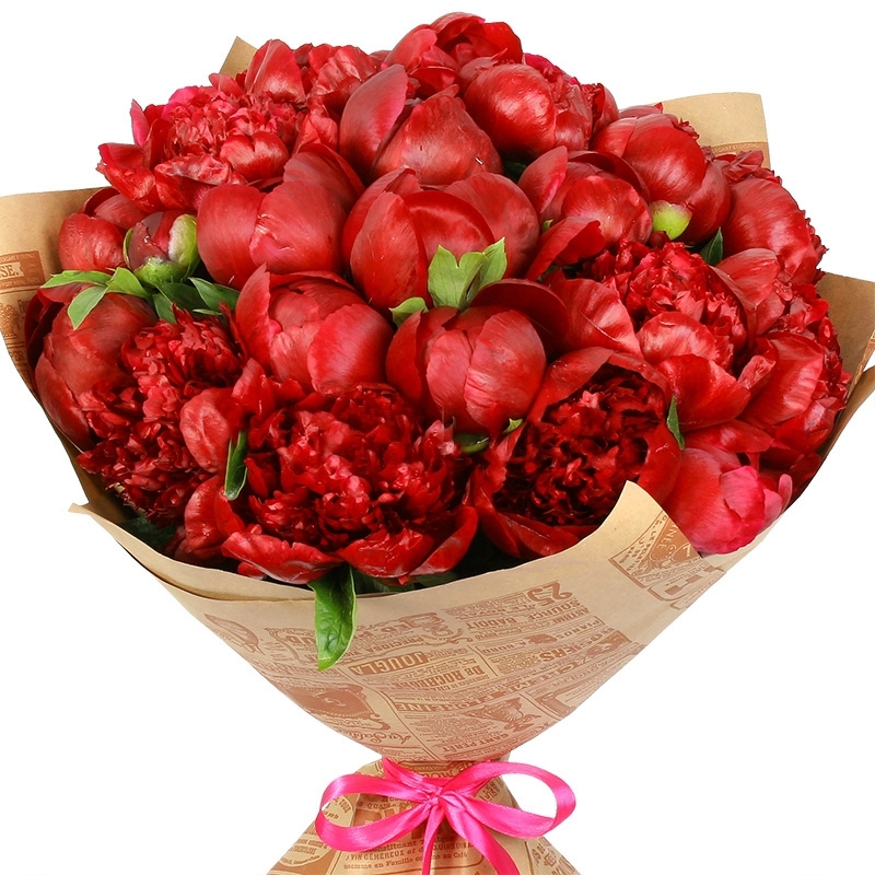 Букет состоит из 25 красных пионов, крафт, атласная лента.