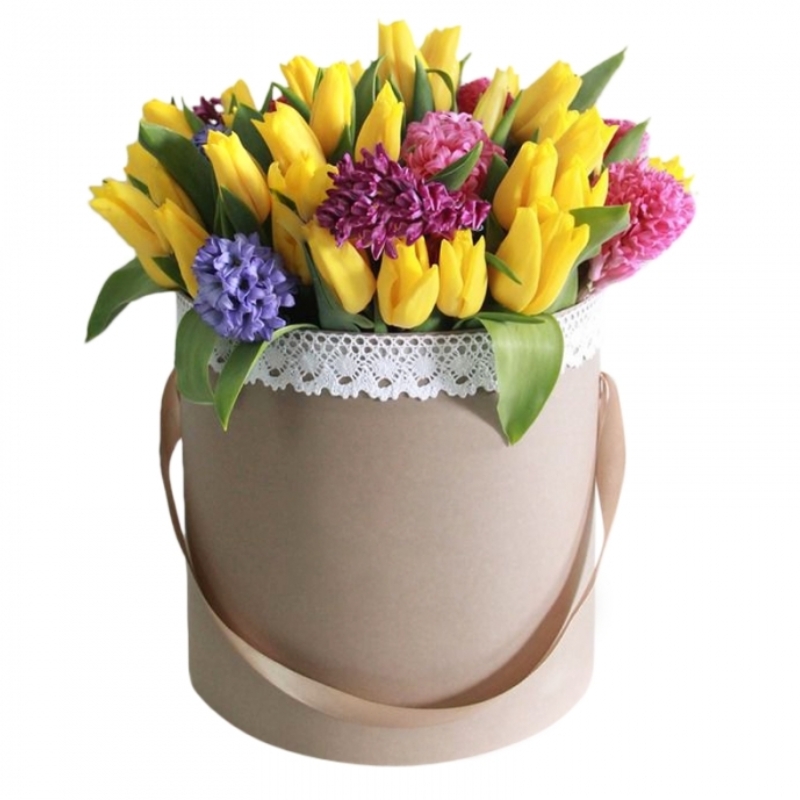 Букет состоит из 29 желтых тюльпанов, 7 гиацинтов, коробка, оазис.