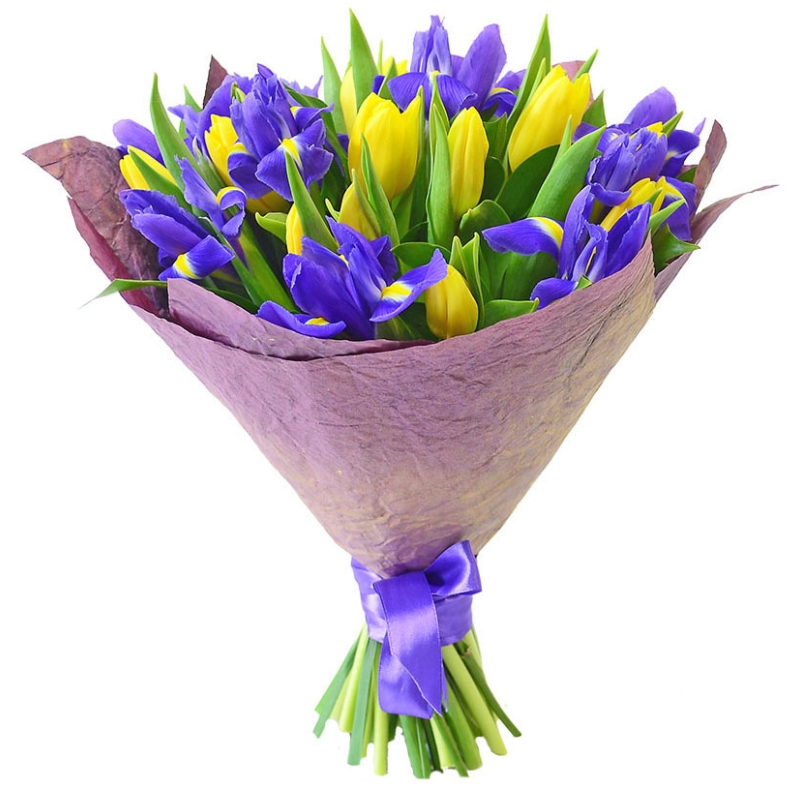 Букет состоит из 10 желтых тюльпанов, 9 ирисов, крафт, синяя лента.