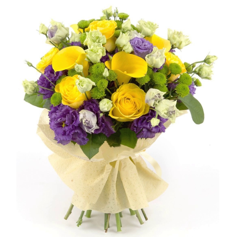 Букет состоит из 6 роз, 5 калл, 5 веток хризантемы Сантини, 7 веток эустомы, зелень, красивая упаковка, атласная лента.