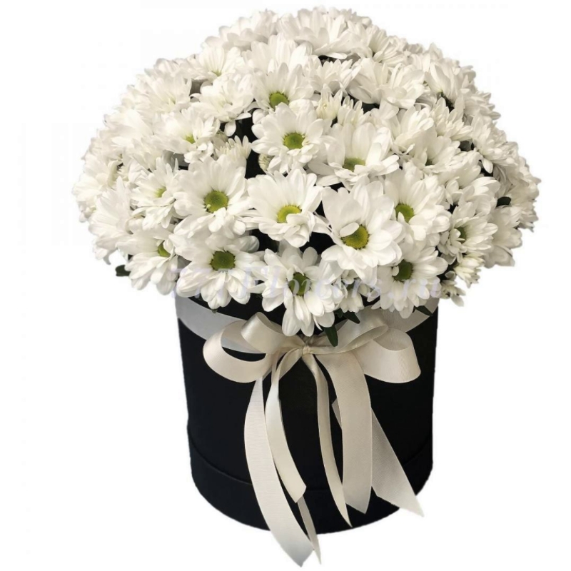 15 веток белых ромашковых хризантем, черная коробка, белая лента.