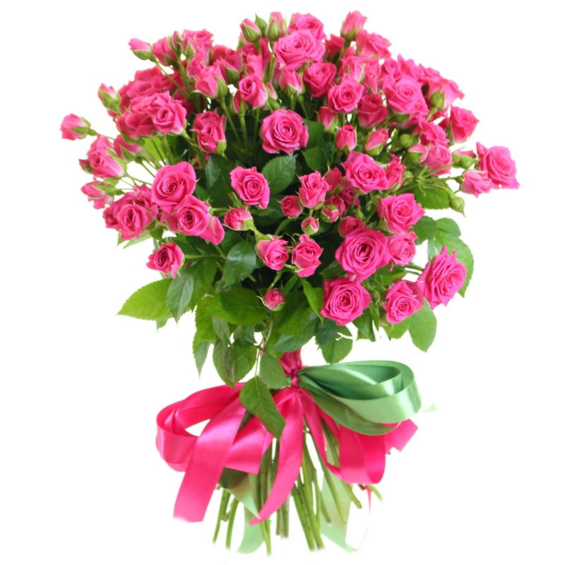 Букет состоит из 19 малиновых кустовых роз, прозрачная упаковка, атласная лента.