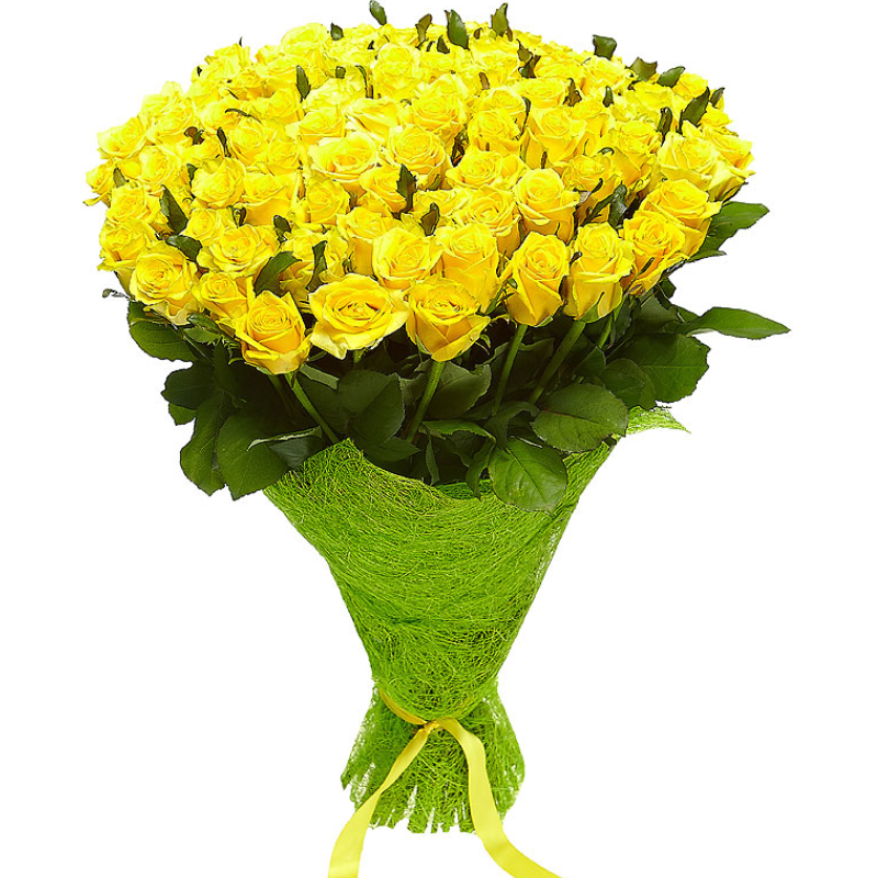 Букет состоит из 101 желтая роза, красивая упаковка, желтая лента.