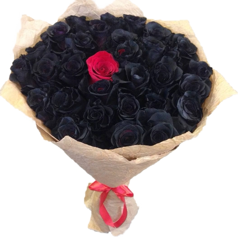 Букет состоит из 34 черные розы, 1 красная роза, крафт , атласная лента.