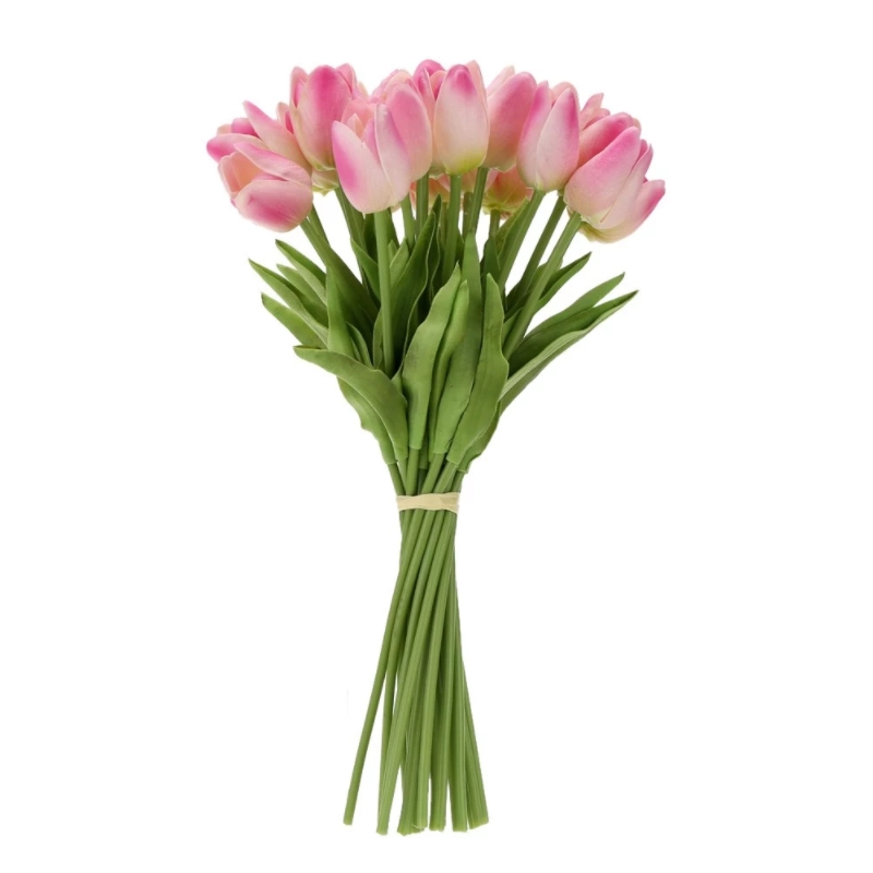 Букет состоит из 17 розовых тюльпанов, прозрачная упаковка, атласная лента.
