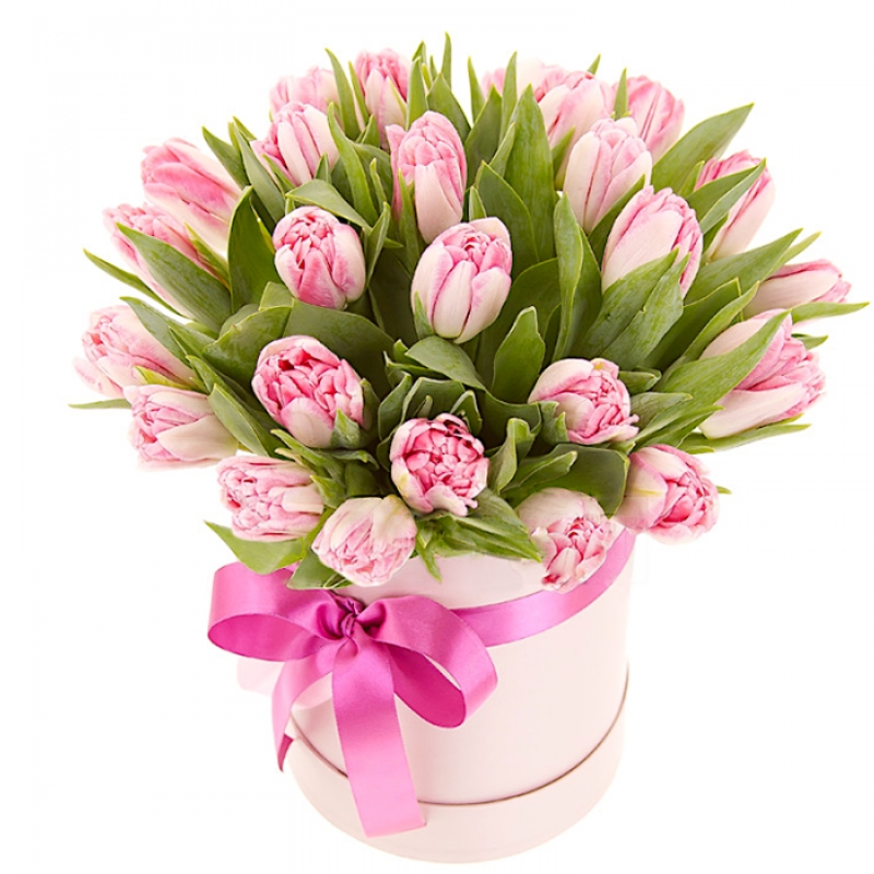 Букет состоит из 25 розовых тюльпанов, коробка, атласная лента, оазис.